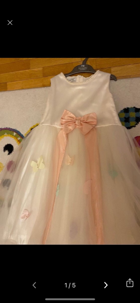 Kolsuz, vücuda oturan beyaz kız çocuk elbisesi, pastel pembe fiyonk detaylı. Bohem tarz, nakışlı kelebeklerle şeffaf etekli, yumuşak sentetik kumaş kelebekleri 3 boyutlu