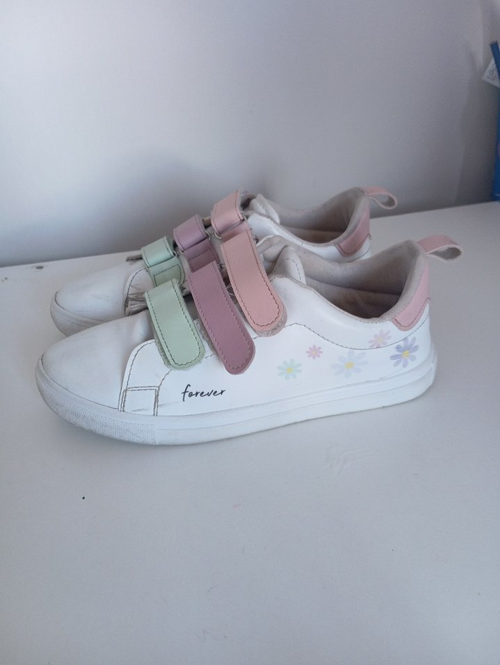 Beyaz tabanlı, pastel tonlarda floral desenli ve cırt cırtlı kız çocuk spor ayakkabısı. Kauçuk tabanlı, trend sokak stili için uygun. Bir tanesinin önünde çizik var başkada sorunu yok