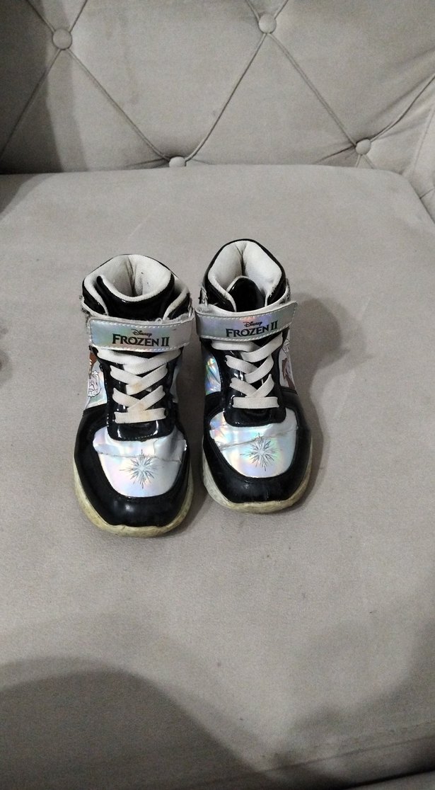Kız çocuklarına özel, Frozen II baskılı, renkli ve beyaz spor ayakkabı. Cırt cırtlı ve kauçuk tabanlı, sokak modasına uygun rock punk tarzında. Çok ufak soyulması var.