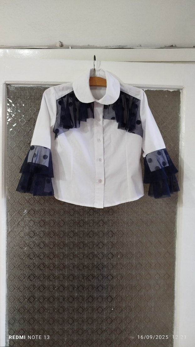 Beyaz, kol ve yaka tül fırfırlı regular fit kız çocuk gömlek. Göğüs ve kollarda gri puantiyeli tül fırfırlar ve nakışlı desen bulunur. ürün kullanılmamış sıfırdır 2 kol arası 38 cm kol boyu tül ile 38 cm boy 42 cm