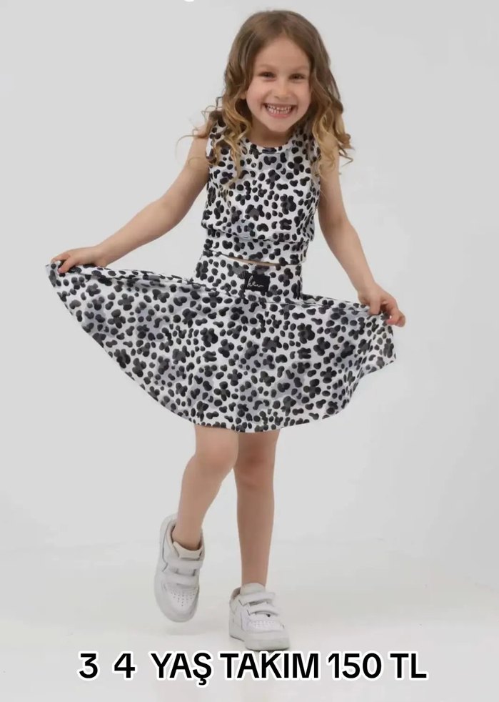 Kız Çocuk Beyaz Gri Desenli Salaş Elbise