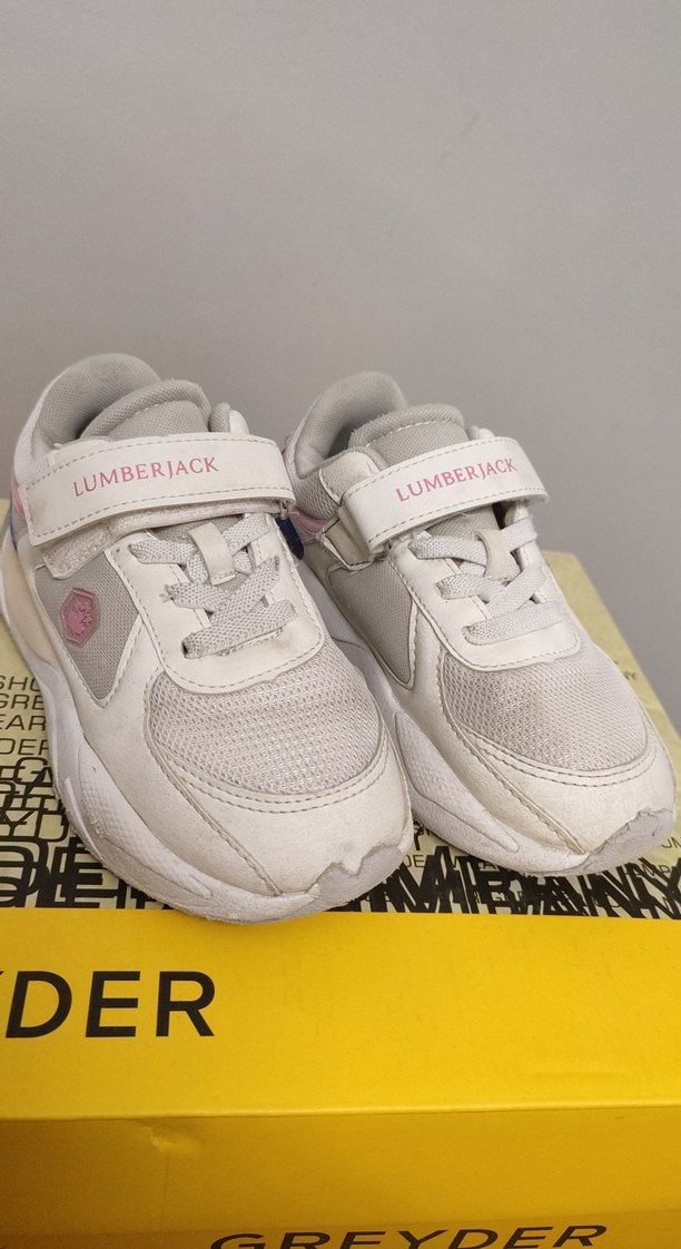 28 numaradır. Beyaz ve gri renklerde, baskılı detaylara sahip kız çocuk spor ayakkabısı. Velcro bant ve kauçuk tabanlı, Lumberjack marka.