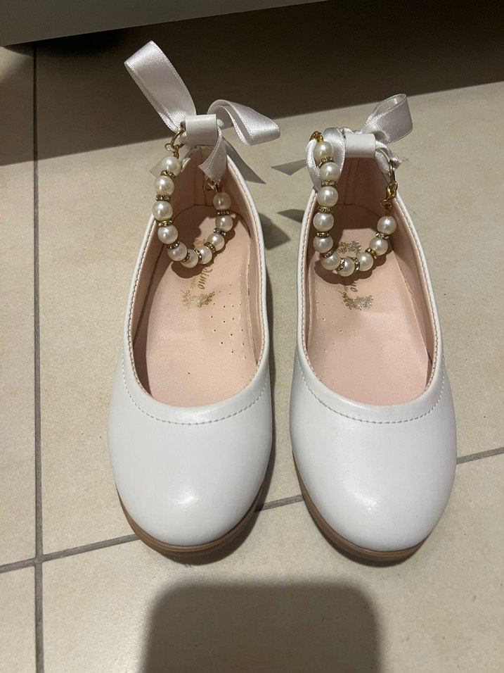 Beyaz kız çocuk babetleri, inci detaylı bileklikler ve düzgün yüzeyle modern klasik tarzı birleştirir. Rahat kauçuk tabanlıdır.