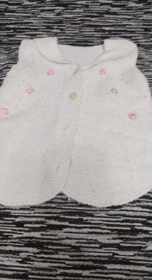 Beyaz renkli, düğmeli ve işlemeli çiçek detaylı kız çocuk süveteri, örme kumaştan ve regular fit kesimdedir.