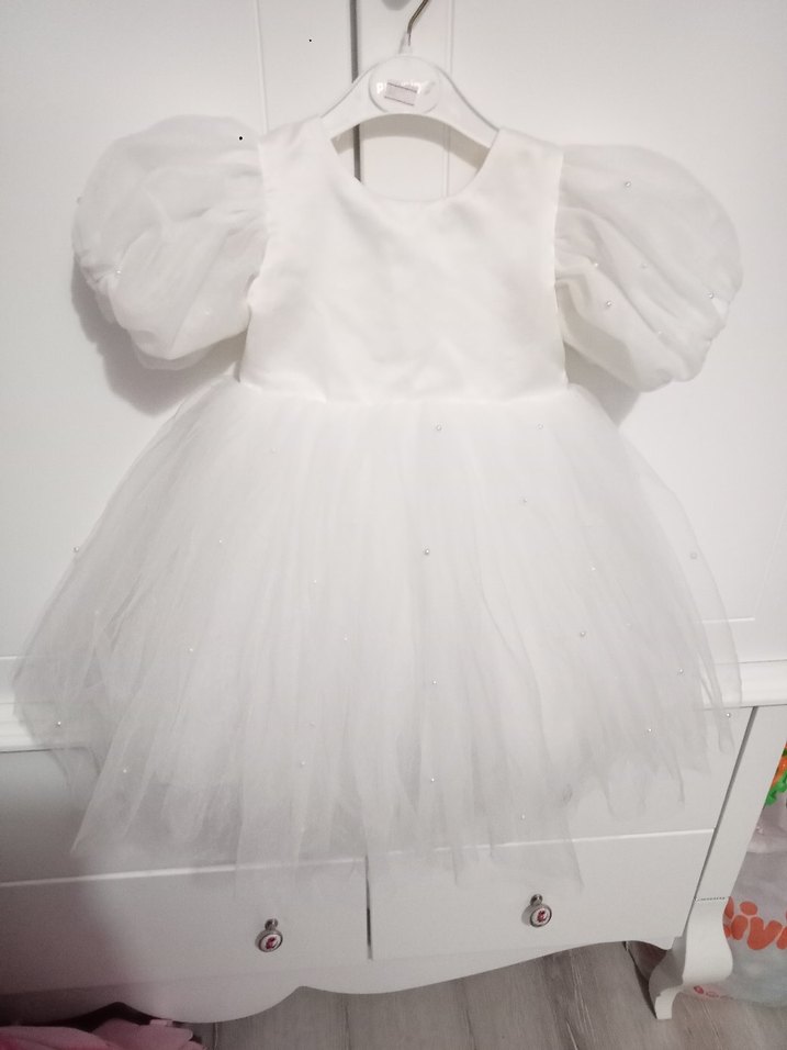Beyaz, oturan kesim kız çocuk elbisesi; kabarık kısa kollu ve tekne yaka detaylıdır. Etek kısmı hafif tül ve zarif süslemelidir. kolun bitanesinde incilerinde bikactane dokulme mevcut onun duainda sorunu yok