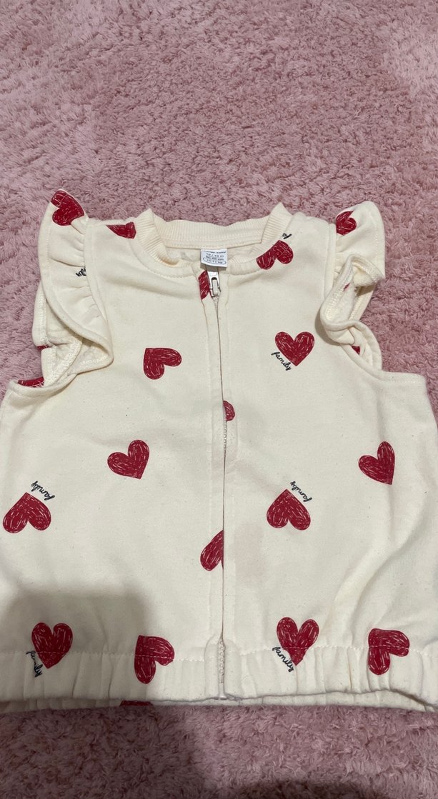Kız çocukları için beyaz, kalp desenli fermuarlı, kolsuz yelek. Yumuşak ve sıcak kumaştan, fitted kesim ve fırfırlı omuzlarla trendy casual tarzı sunar. ❤️