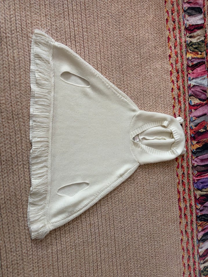 Beyaz renkli, kapüşonlu ve kolsuz örme kız çocuk panço. Nakış detaylı, bol kesim ve püsküllü, bohem tarzda.