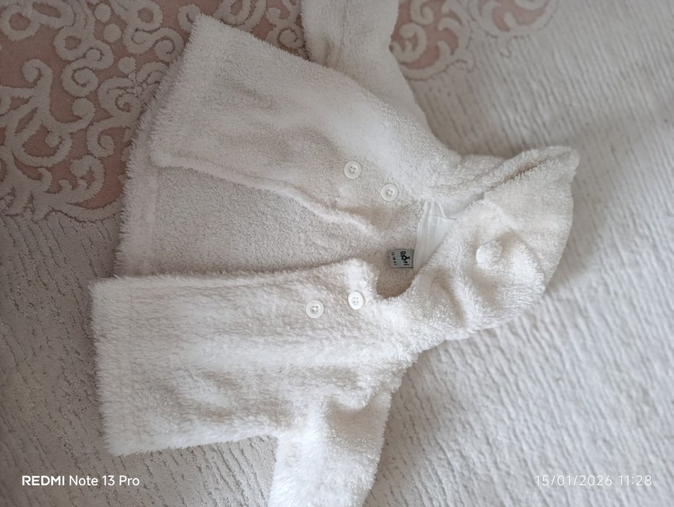 Yumuşak ve sıcak beyaz kapüşonlu kız çocuk bornozu, düğmeli kapama ile rahatlık sağlar. Konforlu ve sıcak kumaştan üretilmiştir.