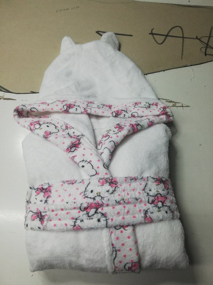 Kız çocukları için yumuşak beyaz bornoz, kulaklı kapüşon ve renkli baskılı detaylarla.