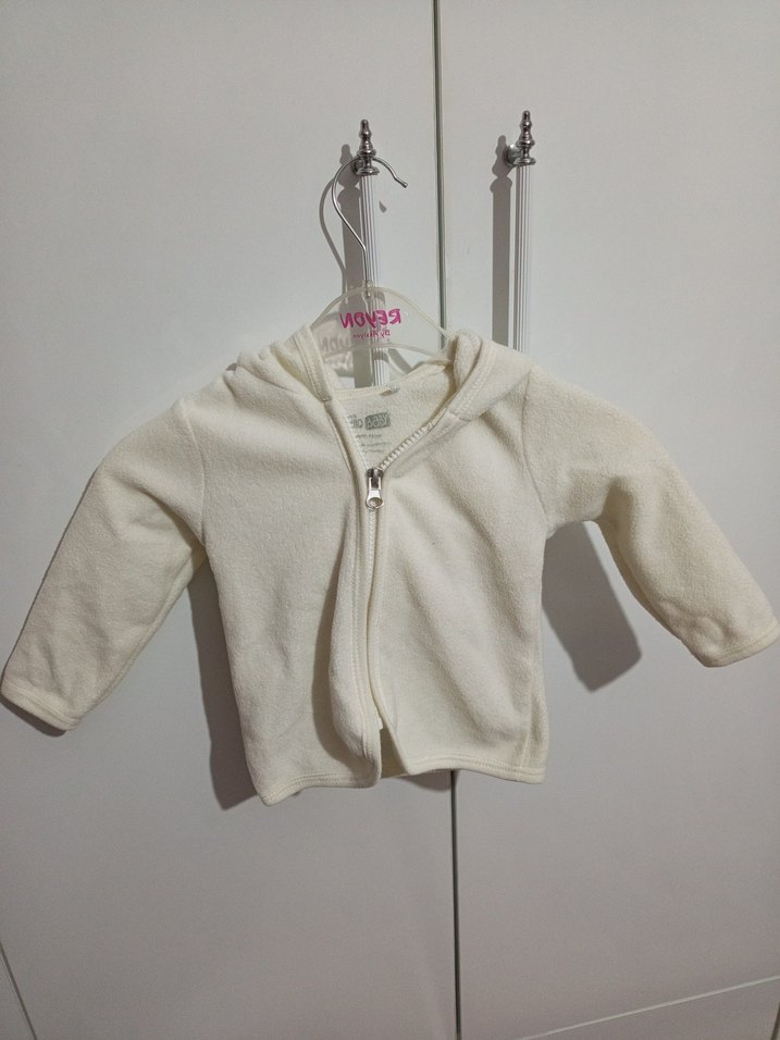 Kız çocuk için kapüşonlu ve ön fermuarlı, yumuşak ve sıcak kumaştan üretilmiş beyaz renkli dar kesim ceket.