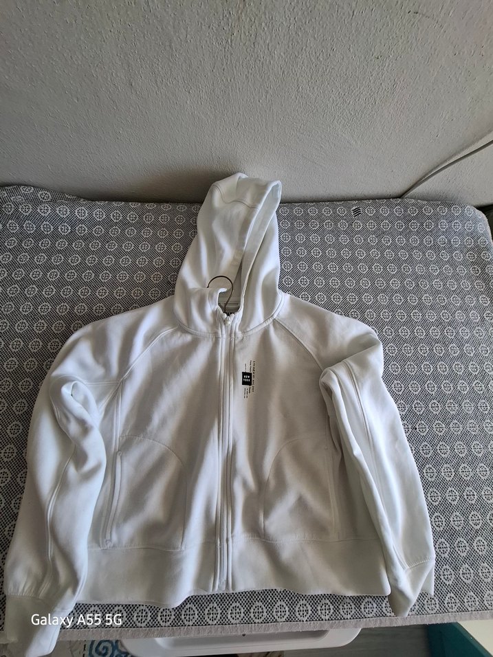 Beyaz renkli çocuk sweatshirt, kapüşonlu ve ön fermuarlıdır. Uzun kollu, vücuda oturan kesime ve normal boy uzunluğuna sahiptir. Rahat ve sıcak kumaştan üretilmiştir.