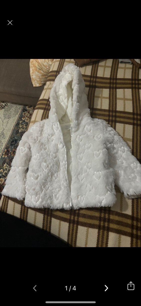 Kapüşonlu, beyaz kız çocuk ceketi, yumuşak kumaş ve kalp desenli kürk detaylı.