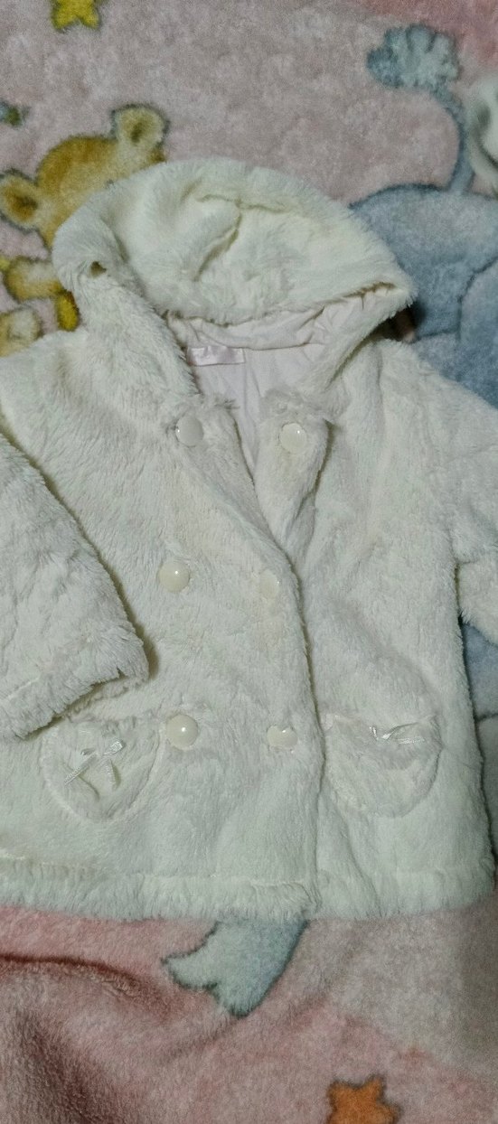 Beyaz kapüşonlu kız çocuk montu, yumuşak ve sıcak kumaş, kürk detayları ve ön ceplerle sokak tarzına uygun. ❄️