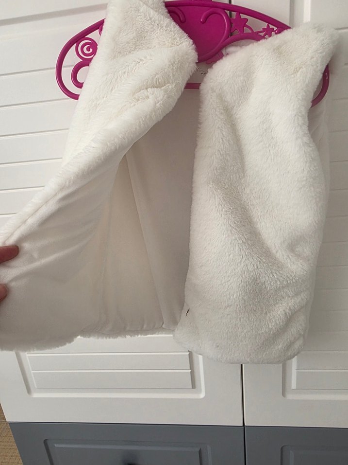 Beyaz renkli, kapüşonlu ve kolsuz, kürk detaylı yumuşak dokulu kız çocuk yeleği.