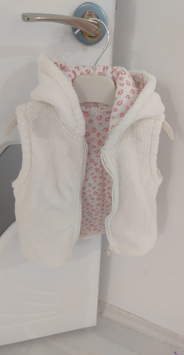 Kız çocuklar için yumuşak ve sıcak kumaştan, kapüşonlu ve kürklü detaylı, sade pastel beyaz dış yüzeyli, desenli iç astarlı dar kesim yelek.