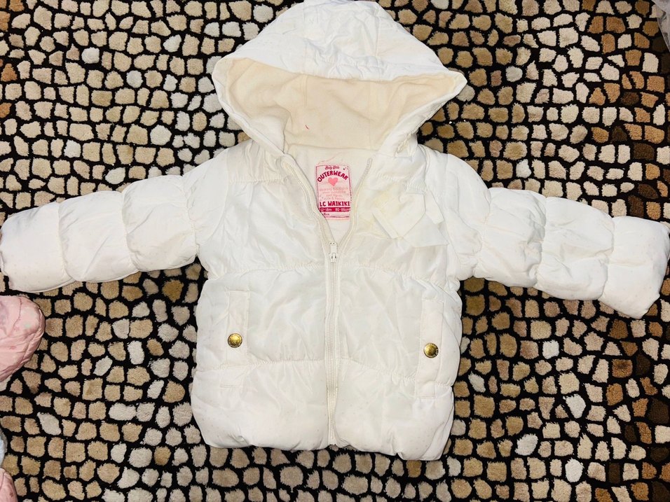 Kapüşonlu, düğmeli cepleri olan beyaz, ince kesim kız çocuk montu. Yumuşak ve sıcak kumaştan üretilmiştir.