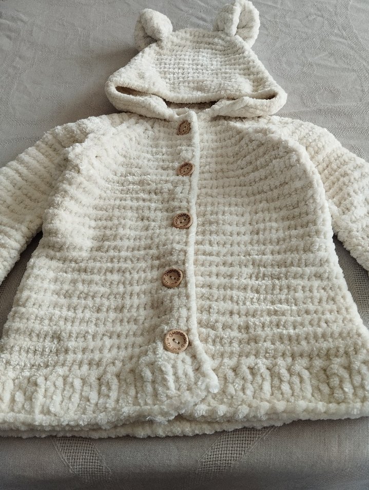 Uzun kollu, bol kesim beyaz örme hırka, kapüşonunda sevimli kulak detayları ve önünde ahşap düğmeler bulunur.