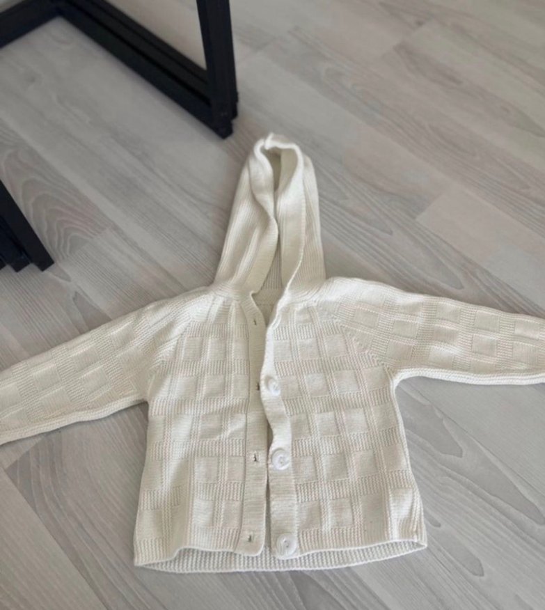 Uzun kollu, kapüşonlu ve düğmeli beyaz kız çocuk örgü hırka. Hafif kare desenli, yumuşak örme kumaştan yapılmıştır.