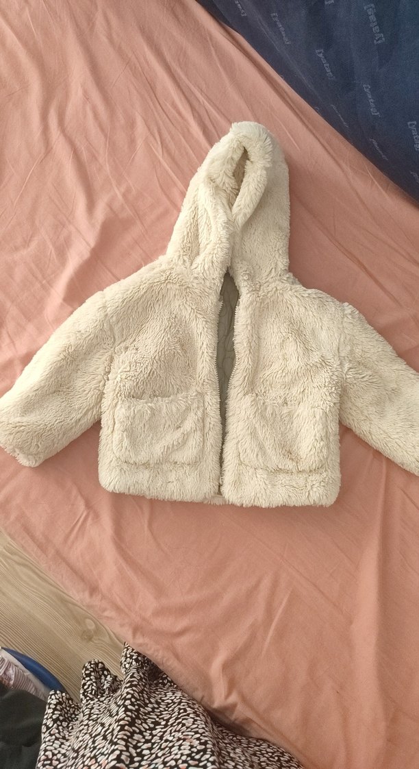 Koton marka 2/3 yaş Bol kesim beyaz kapüşonlu ceket, yumuşak peluş detaylı ve önünde iki cep bulunur. Sıcak tutan rahat bir kumaştan üretilmiştir. çift taraflı kullanılabilir.