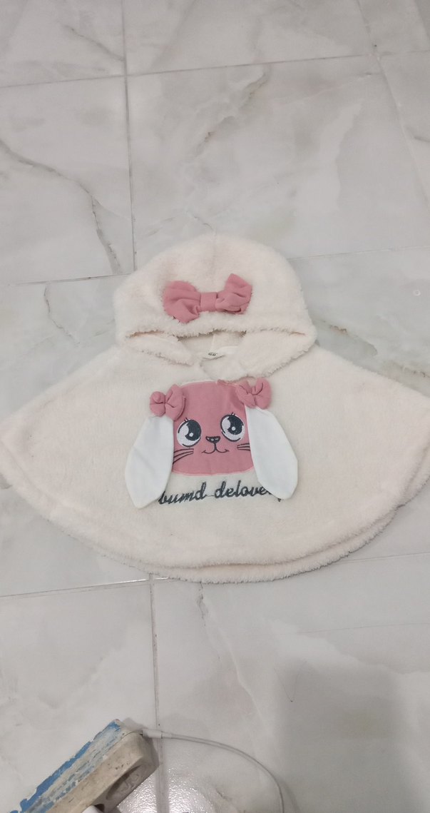 Uzun kollu, kapüşonlu beyaz kız çocuk ponchosu, yumuşak ve sıcak dokuda, sevimli hayvan yüzü baskılı ve kürk detaylıdır. Rahat bol kesim.