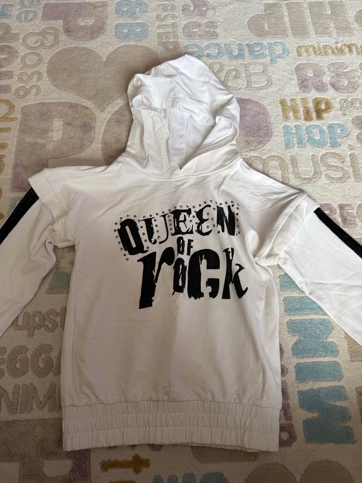 Beyaz renkli, uzun kollu, kapüşonlu ve baskılı 'QUEEN of ROCK' yazılı kız çocuk sweatshirt. Çok şık çok iyi durumda. 8-10 yaş arası.