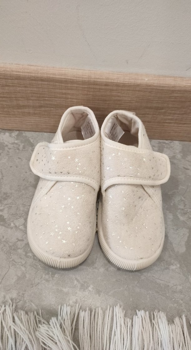 Beyaz, kaydırmaz tabanlı ve cırt cırt bantlı kız çocuk terliği. Hafif yıldız desenli, rahat. ev ayakkabısı ⭐