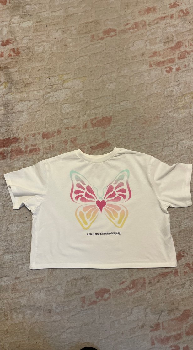 Kız Çocuk Beyaz Kelebek Baskılı Crop Oversize Tişört