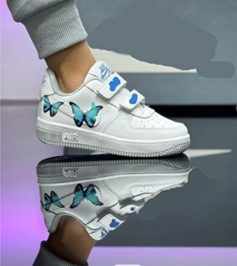 Beyaz renkte, mavi kelebek desenli ve cırt cırtlı kız çocuk spor ayakkabısı. Kauçuk tabanlı, trend günlük stil için uygundur. ışıklı yeni kutulu 22-23-24-25 numara mevcut