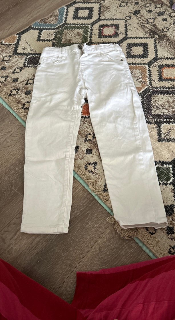 Kız çocukları için beyaz pamuk pantolon, rahat kesim ve kemerli bel özelliğiyle trend sokak modasına uygun. Hafif ve desensiz kumaş kullanılmış.