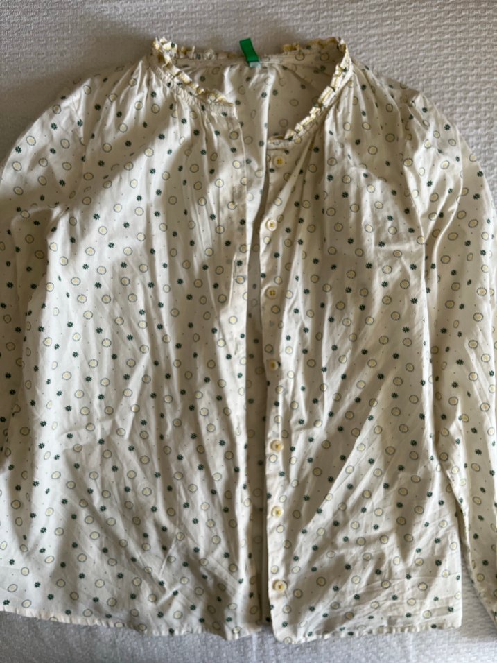Beyaz keten gömlek, uzun kollu, yuvarlak yakalı ve düğmeli. Gevşek kesim, hafif noktalı desenli bohem tarzda.