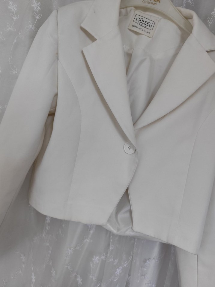 Kız çocukları için keten kumaştan, düğmeli ve parlak beyaz renkte. Notlu yaka ve uzun kollu, modern klasik tarzda, GOLSEL markalı bolero.