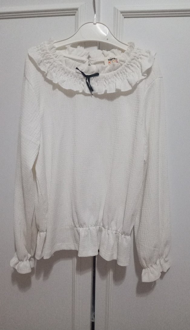 Kız çocuk beyaz keten bluz, uzun kollu ve bol kesimdir. Fırfırlı yuvarlak yaka ve etek ucu ile sade bir sokak stili sunar.