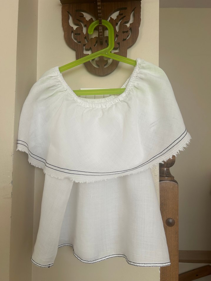 Keten kumaştan yapılmış, beyaz renkli, bol kesim kız çocuk bluzu. Kısa kollu, fırfırlı ve kayık yaka detaylı, bohem tarzda hafif ve desensiz.