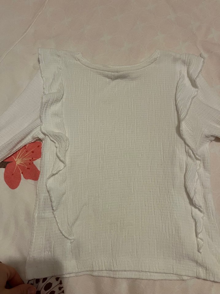 Kız çocukları için keten kumaştan, uzun kollu, yuvarlak yaka ve yanlarda fırfır detaylı, bol kesim beyaz bluz. Kolunda kalem lekesine benzer bir lekesi var ben çıkartmaya uğraşmadım.