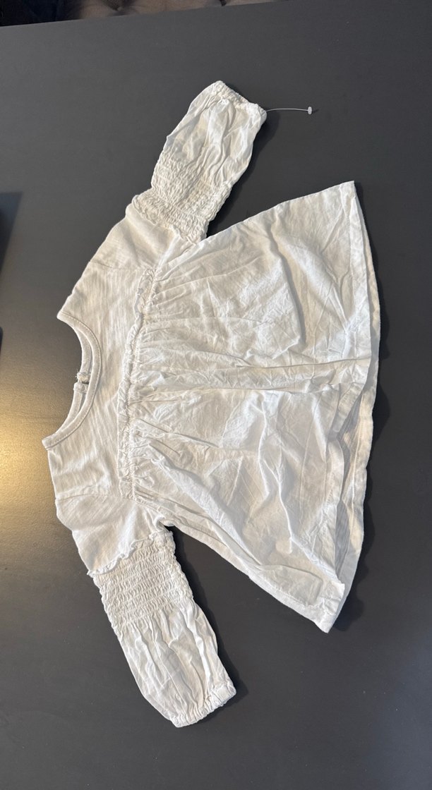 Beyaz renkli kız çocuk keten bluz, uzun fırfırlı kolları ve bol kesimi ile rahat bir kullanım sunar. Bohem tarzda, yuvarlak yakalıdır.