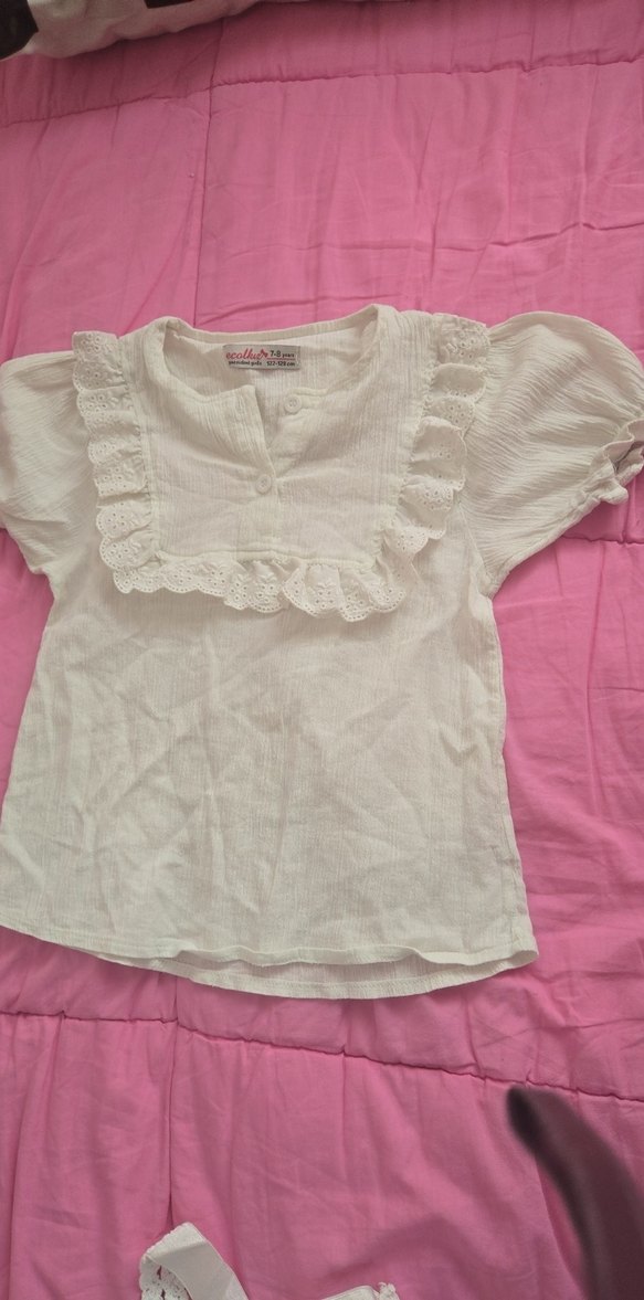 Beyaz keten kumaştan, kısa kollu, V yakalı, fırfır detaylı ve nakış işlemeli, bol kesim bohem tarzı kız çocuk bluzu.