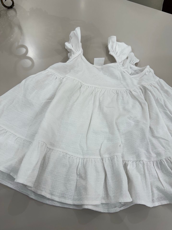 Keten kumaştan, askısız ve fırfırlı detaylı, bol kesim beyaz kız çocuk elbisesi. Bohem tarzda, pastel ve sade görünümlü.