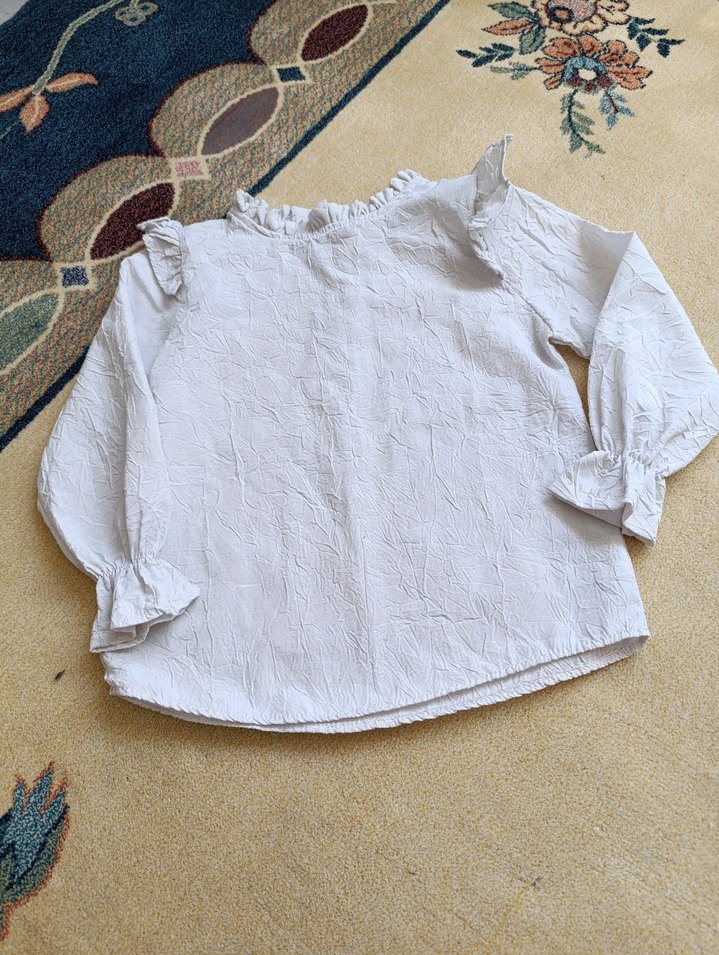 Kız çocukları için beyaz keten gömlek, uzun kollu, bol kesim ve omuz ile manşetlerde fırfır detaylıdır. Yuvarlak yaka ve sade bohem tarzındadır.