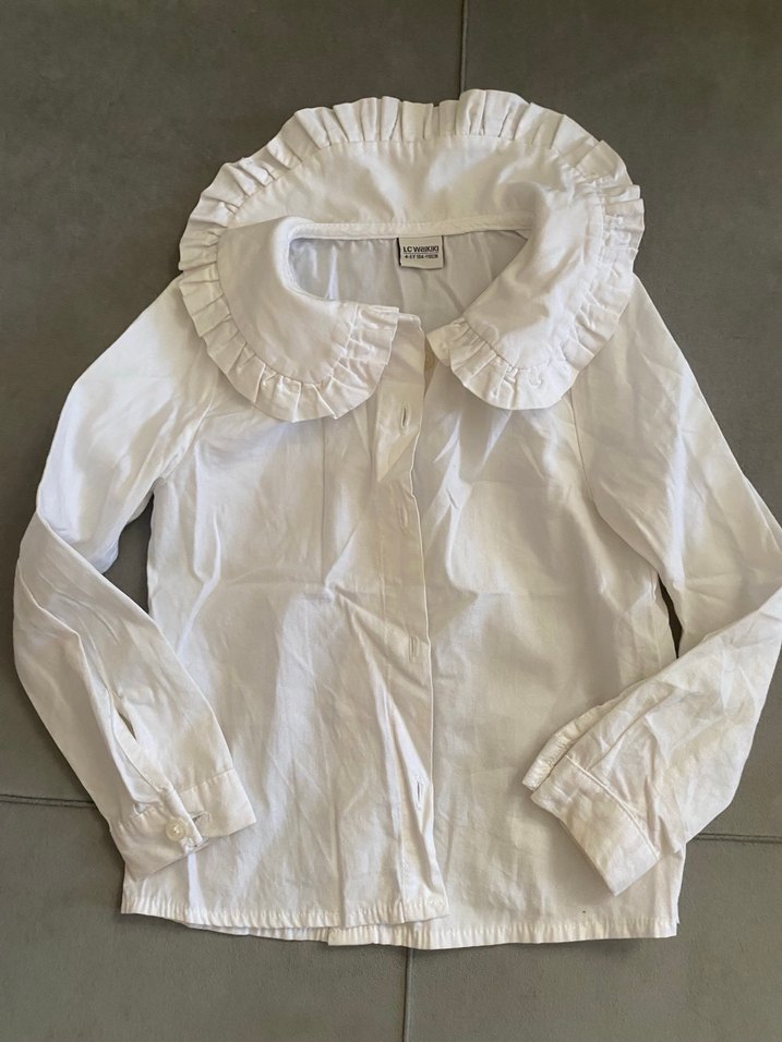Beyaz keten kumaştan, fırfırlı yakalı, uzun kollu, bol kesim kız çocuk gömleği. Düz ve sokak stiline uygun basic tasarım. Tertemiz