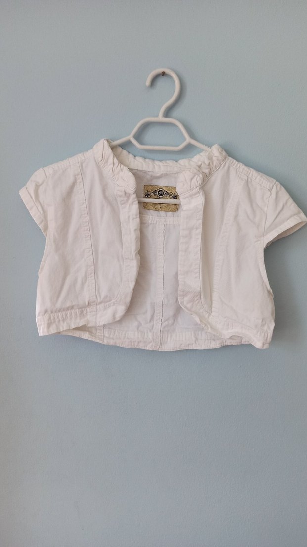 Kız çocukları için kısa kollu, yakalı beyaz keten bolero. Düğmeli, bol kesim ve sade tasarıma sahiptir.