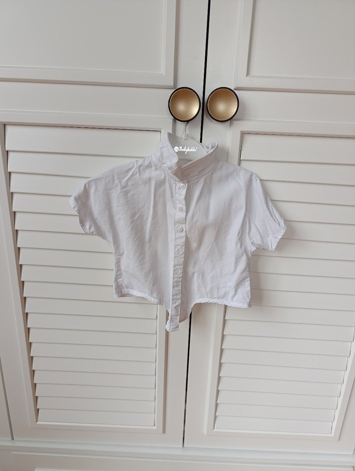 Keten kumaştan, düğmeli ve yakalı, bol kesim kız çocuk gömleği. Kısa kollu, sade beyaz renkte rahat bir modeldir.