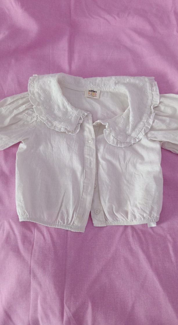 Keten kumaştan, beyaz renkli, kısa kollu, düğmeli ve fırfırlı yakalı kız çocuk gömleği, rahat ve sade bir tarz sunar.