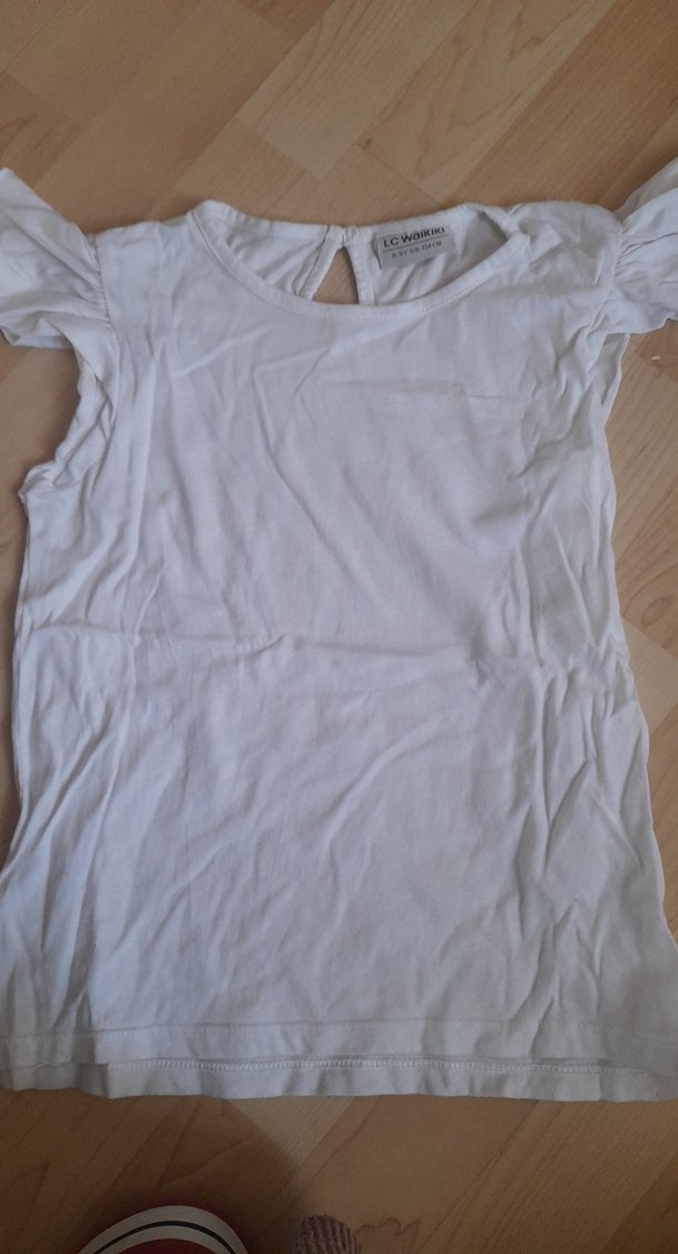 Keten kumaştan yapılmış, beyaz renkli, kısa kollu ve yuvarlak yakalı rahat kesim kız çocuk tişörtü.