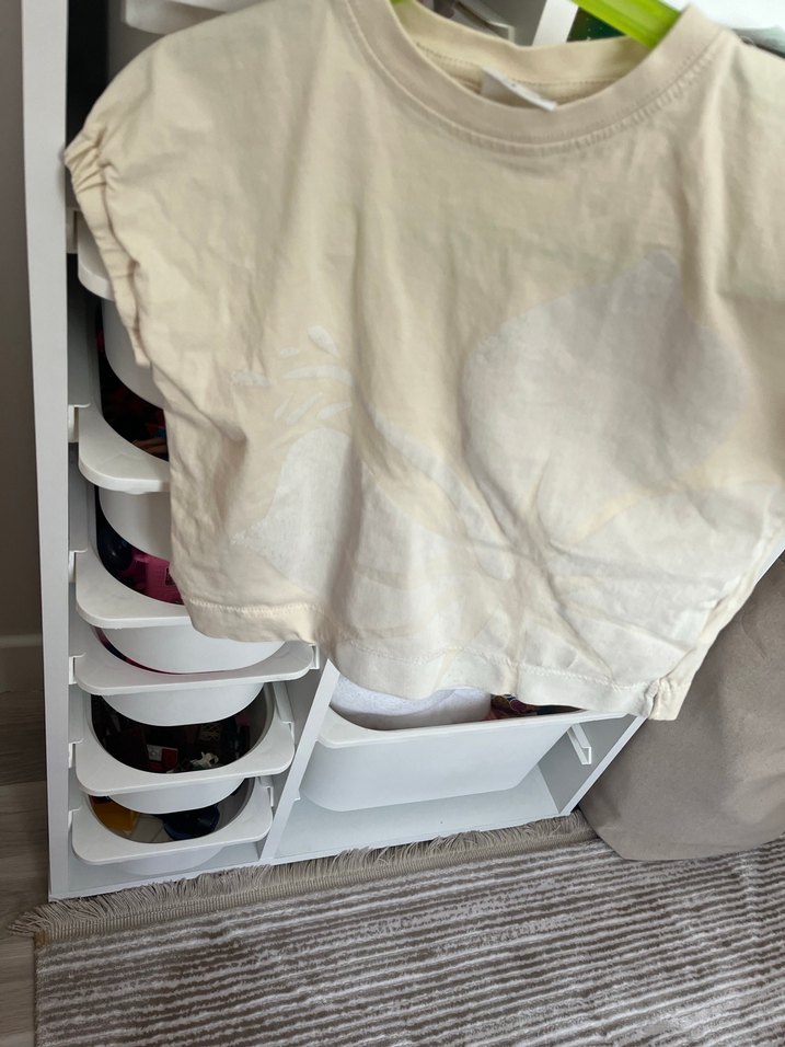 Keten kumaştan yapılmış, kısa kollu, bisiklet yaka ve fırfır detaylı beyaz renkli bol kesim kız çocuk tişörtü.