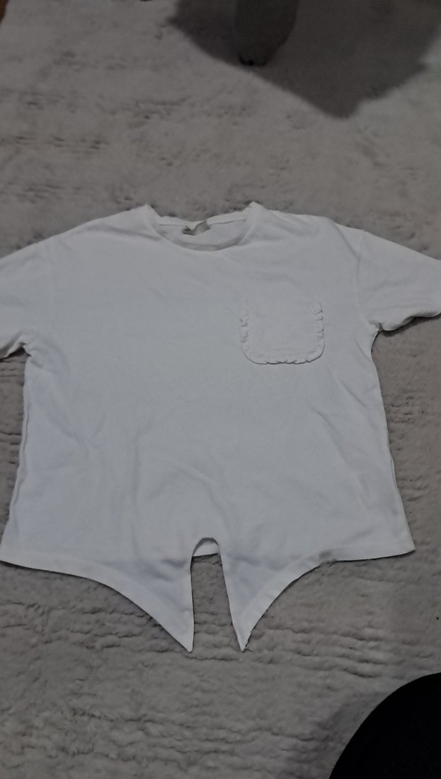 Yumuşak keten kumaştan yapılmış beyaz, kısa kollu kız çocuk tişörtü. Yuvarlak yaka ve bol kesime sahip, sade tasarım ve küçük cep detaylıdır. Hic giyilmedi