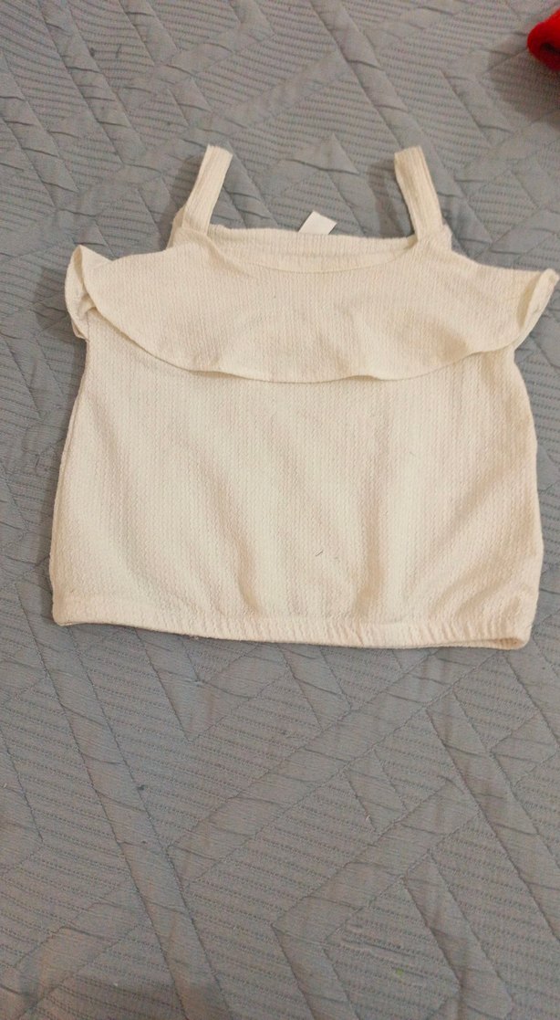 Keten kumaştan yapılmış, kolsuz, beyaz renkte, fırfırlı ve salaş kesime sahip kız çocuk bluzu.