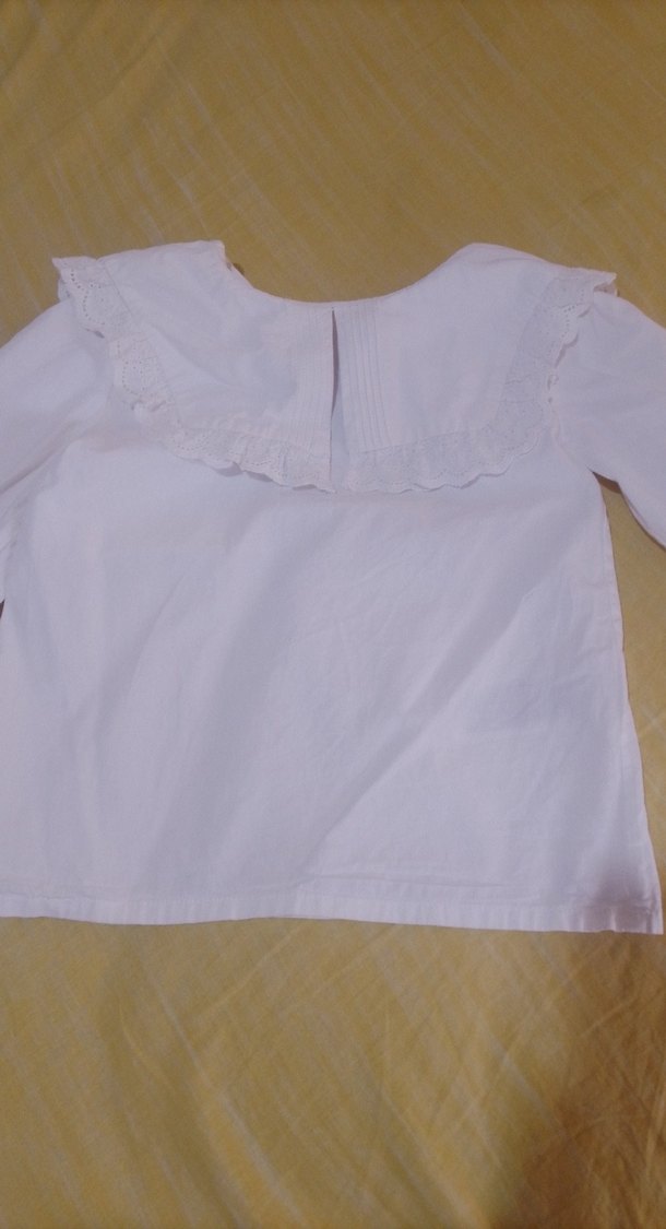Kız çocukları için beyaz keten kumaştan, yakalı ve fırfırlı detaylara sahip, uzun kollu bol kesim gömlek. Pastel ve sade tasarım.
