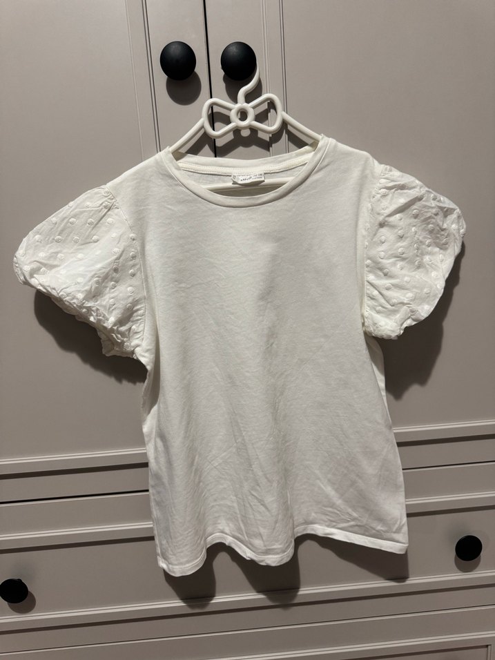 Kız çocukları için kısa kollu, keten kumaştan, fırfırlı kollara sahip, yuvarlak yakalı ve bol kesim beyaz tişört. Sokak stili için uygun.