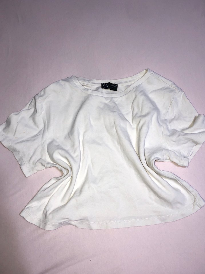 Kız çocukları için beyaz keten kumaştan yapılmış, kısa kollu ve yuvarlak yakalı salaş kesim bir tişört.