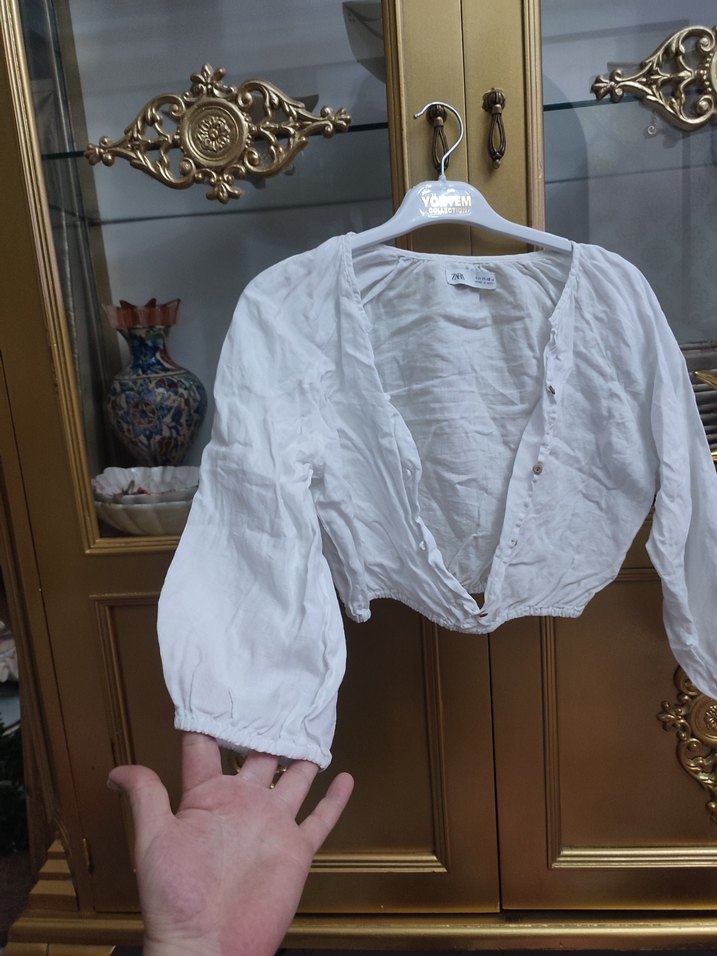 Uzun kollu, düğmeli beyaz keten bolero, bol kesim ve askısız yakalı, genç ve rahat tarz için uygundur. orjinal Zara marka 11_12 yaş